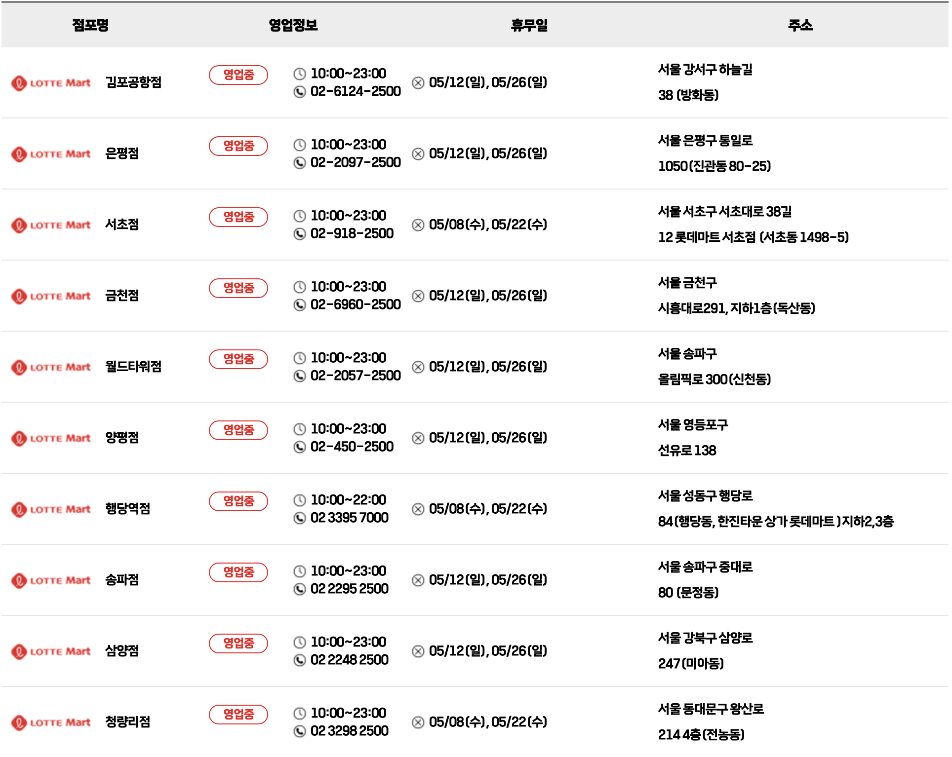 | 이마트 광명소하점 | 05월 12일 , 26일 |